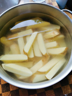 Lekker dikke frieten snijden, wees wel selectief . Moeten mooie gelijkmatige frieten worden.